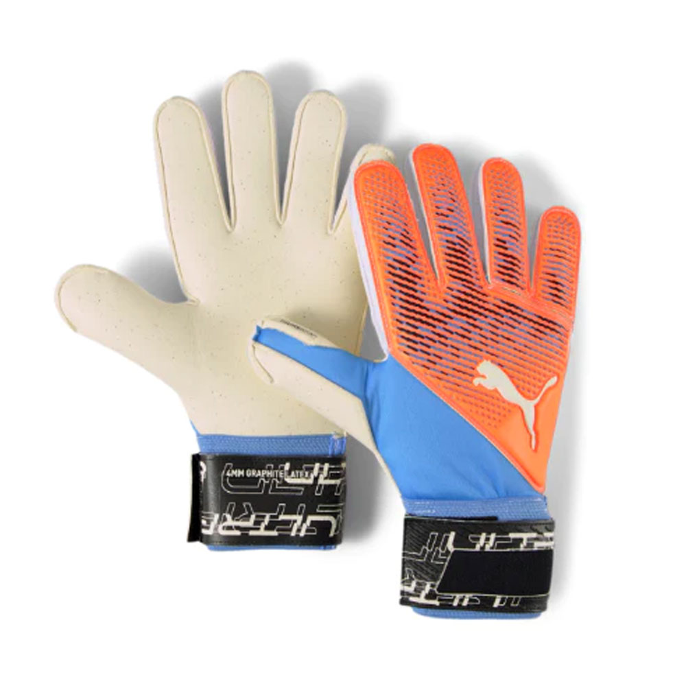 PUMA Ultra Protect 2 RC Goalkeeper gloves have mesh between the fingers for increased air flow, cushioned pads for extra finger protection, and Ultimate Grip latex for better grip control.