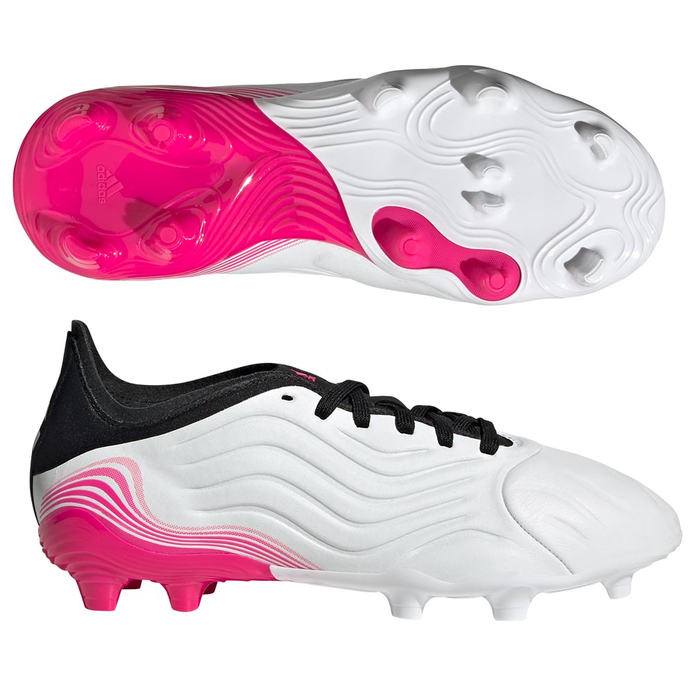 Designed with a premium k-leather upper which softens your touch on the ball, the adidas Copa Sense.1 Junior is for the daring players who can leave a lasting impact with any touch. Color: Footwear White/Footwear White/Shock Pink. Check out more our full seleciton of Kids Firm Ground Cleats here!