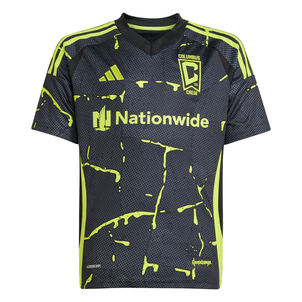Get ready to turn heads with the adidas Columbus Crew 2025/26 Youth Away Jersey, a spine-chilling tribute to R.L. Stine?s Goosebumps series and their club supporters. Featuring ultraviolet-reactive yellow slime dripping over a sleek black base, this jersey brings eerie energy to the pitch. The bold design includes a heat-applied team badge, spooky jock tag details, and Columbus Crew on the upper back neck. Engineered with lightweight, moisture-managing AEROREADY fabric for peak performance. Keep your game frighteningly sharp with this Columbus Crew Away Jersey.